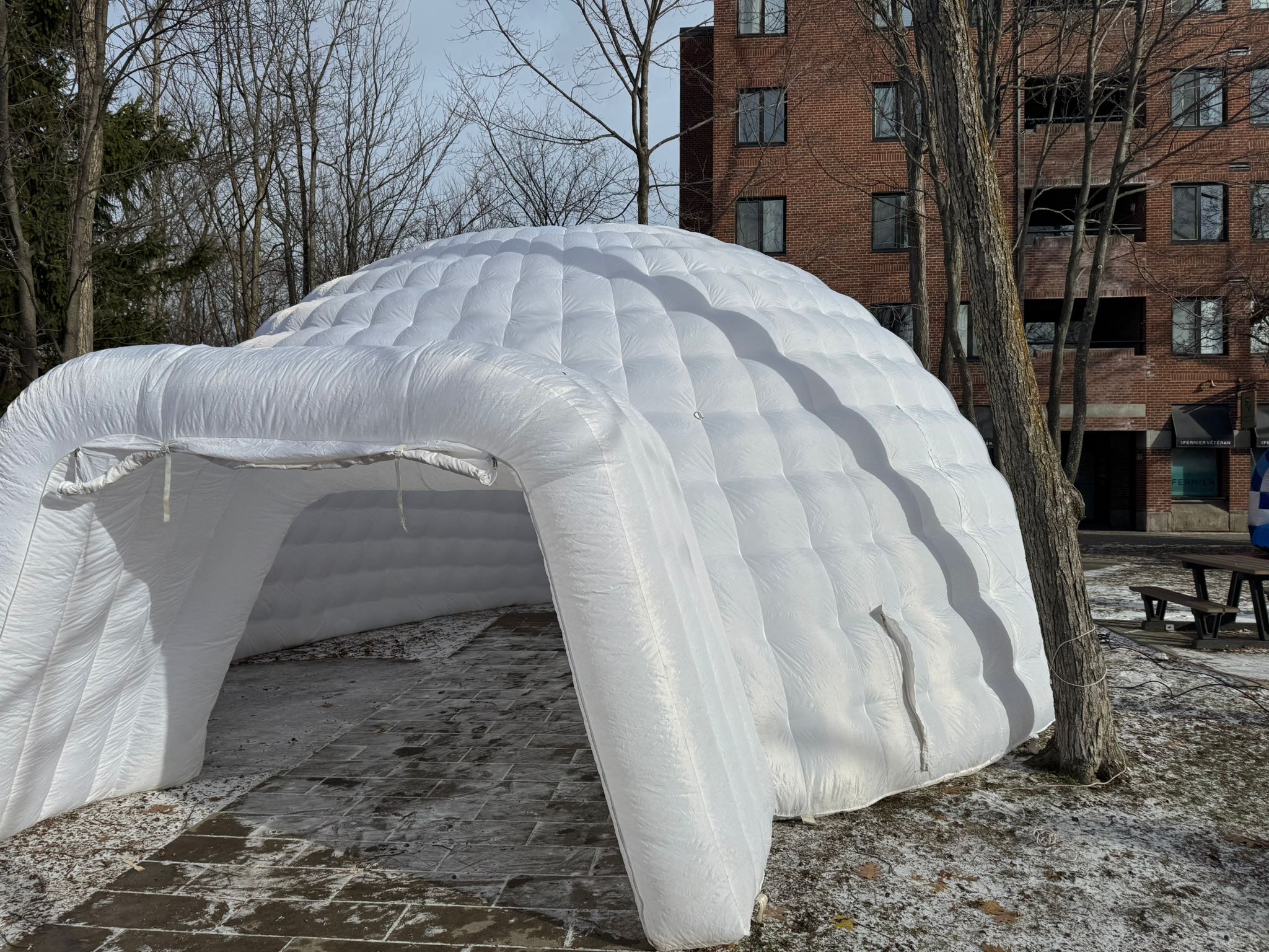 L’Igloo Géant Illuminé : Véritable pièce maîtresse visuelle, notre igloo de 20×20 pieds a servi de point de ralliement. Sécurisée avec plus d’une tonne de lestage pour résister aux vents de Québec, la structure a offert un rendu visuel spectaculaire, validé par notre équipe dès l’aube.